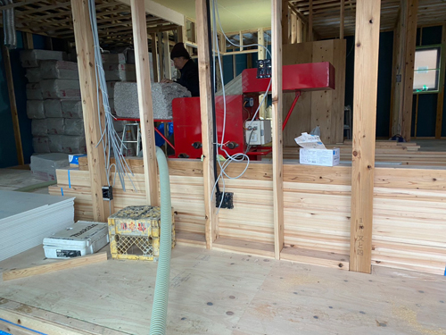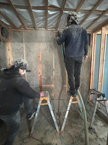 内部の下地工事などを進めていた中間の現場では、ウォールスプレー工法によるセルロース断熱工事に入りました。