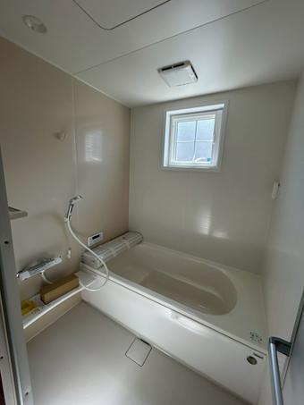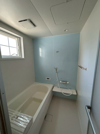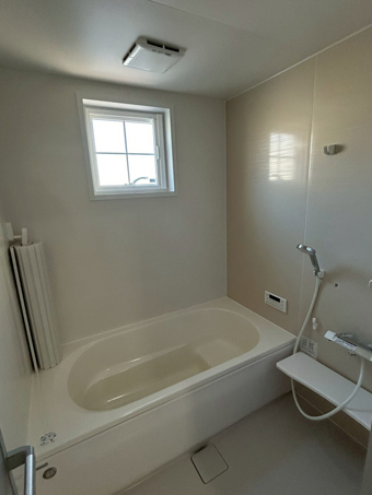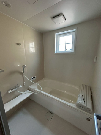明るく見える清潔感のあるカラーで広く感じられ、リラックスできるバスルーム。