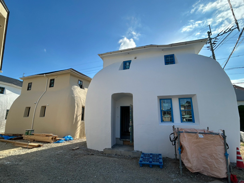斜めに帽子をかぶったような玄関屋根も完成し、曲線の肉厚感も出てど〜っしりとしてきました。