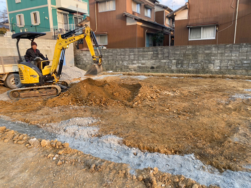先日地縄張りをおこなって建物の位置などを確認した中間の現場では、家の基礎を作るための床掘り工事に入りました。