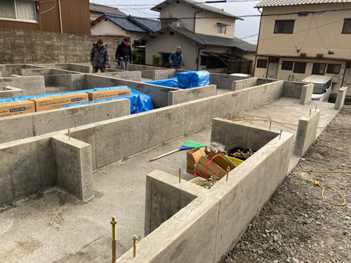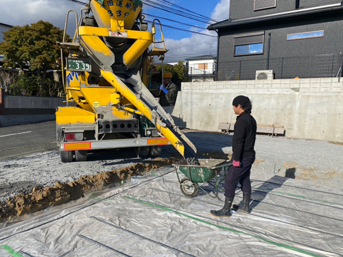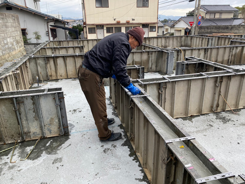 これは基礎の外周に組み立てた型枠の中に、コンクリートを流し込む作業になります。