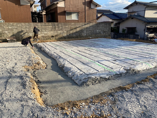 基礎のベース下地工事を進めている中間の現場では、捨てコンクリート打設工事に入りました。