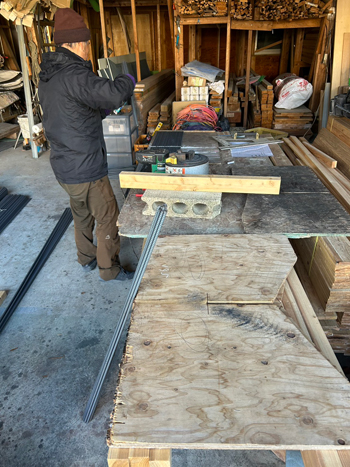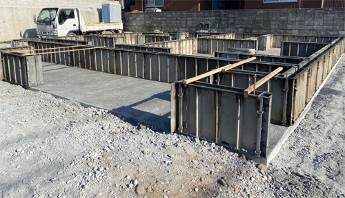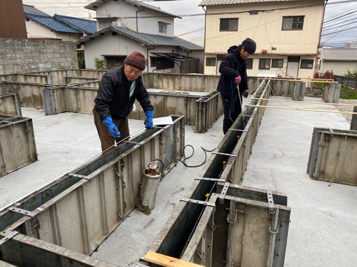 基礎ベースの生コンクリートの養生に入っていた中間の現場では、立ち上がり部分の型枠工事をおこない、その枠の中への生コン打設工事をおこないました。