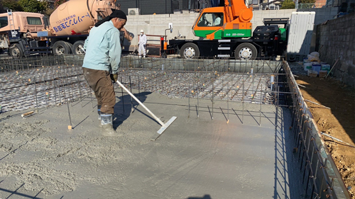 鉄筋をしっかりと覆い固めながら生コンを平らに均し、頑丈な床ベースに仕上げていきます。