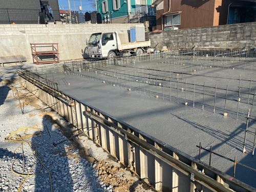 基礎配筋工事を進めていた中間の現場では、基礎の生コンクリート打設工事をおこないました。