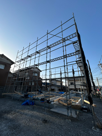 足場設置もおこないましたので、土台敷き工事に入らせていただきます!