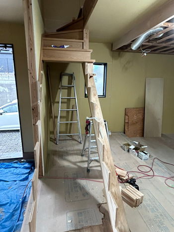 転落防止などの安全性の向上のため、建築基準法でも手すりの設置なども定められていますので、踏み外しなどがないよう細かな施工を進めさせていただきます!