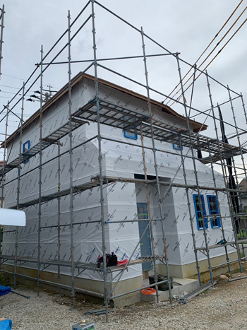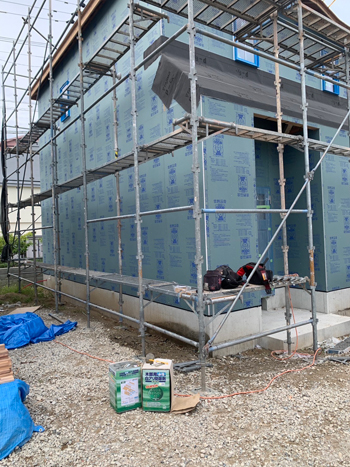 各号の棟上げや壁下地工事を進めている東区の戸建賃貸の現場では、引き続き5号地の外壁モルタル塗り工事を進めています。