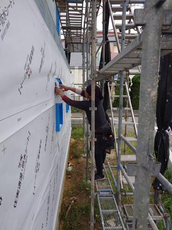 棟上げも終わって屋根工事などを進めていた東区戸建賃貸の2号地の現場では、外部構造用ボード張り工事に入っています。