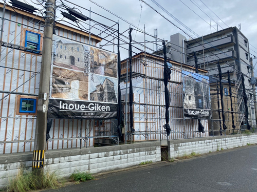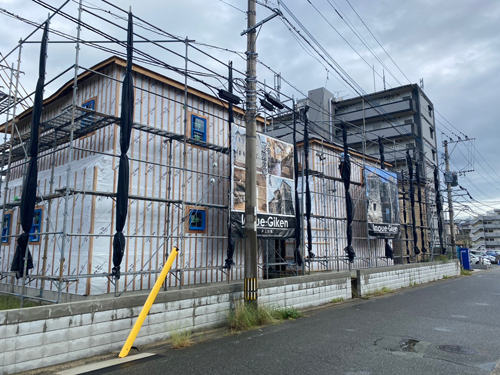 1号地と2号地の基礎型枠の養生が終わった東区戸建賃貸の現場では、型枠バラシ工事を行った2号地の足場工事に入りました。